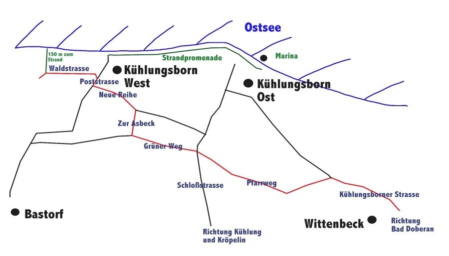 Die Anfahrt erfolgt über die A 20 Ausfahrt Bad Doberan, weiter die Landstraße L 13 bis Bad Doberan, dann weiter die L 12 Richtung Kühlungsborn. Hinter Wittenbeck links in den Pfarrweg Richtung KB West. Über die Ampelkreuzung Schlossstraße in den Grünen Weg. Nach rechts Zur Asbeck. Nach links in die Neue Reihe, weiter in die Poststraße nach rechts und dann links in die Waldstraße, immer Richtung Ostseeklinik. Vor dem letzten Haus auf der linken Seite ist der Parkplatz. Links der 2. von der Straße kommend.
